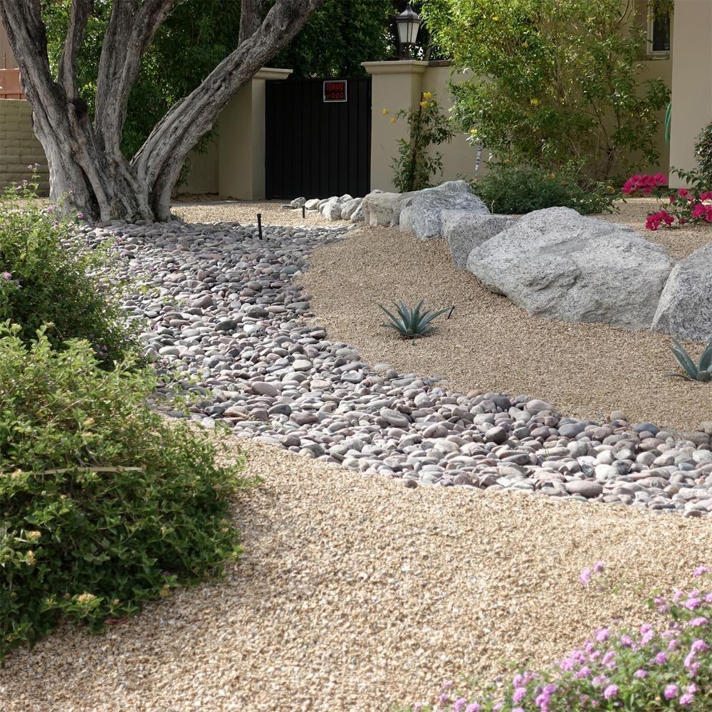 A natural stone dry creek bed designed to guide rainwater, prevent erosion, and add a beautiful desert-style aesthetic.