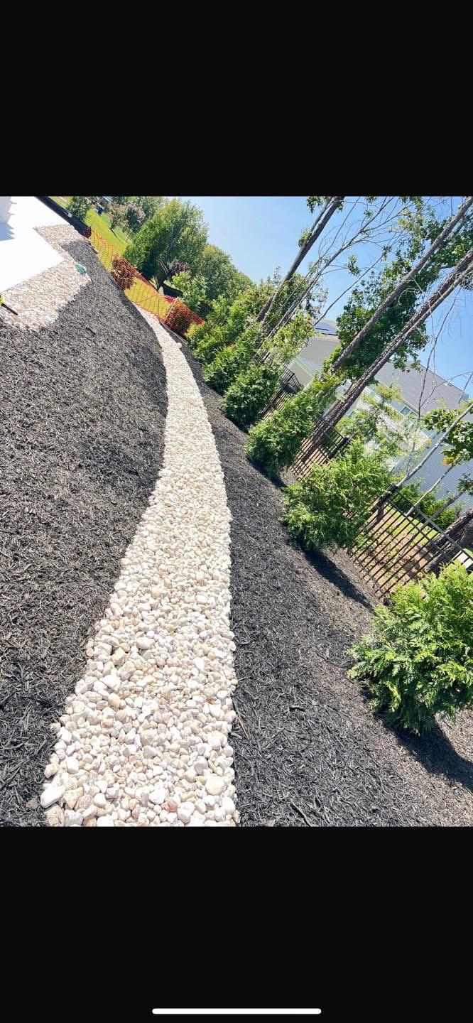 Professional stone and mulch design that highlights garden beds, creates natural elevation, and boosts curb appeal.